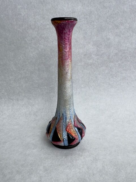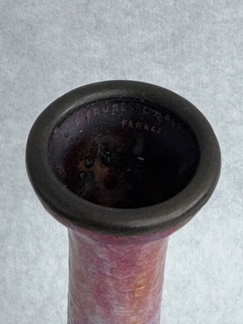 Dit Art Deco vaasje werd vervaardigd door Camille Fauré (1874-1956). Hij was een emaillekunstenaar die vooral bekend stond om zijn ontwerpwerken voor porseleinfabrikant Limoges. Zijn handelsmerk waren figuratieve patronen en bloemenmotieven in rijk geglazuurde kleuren.